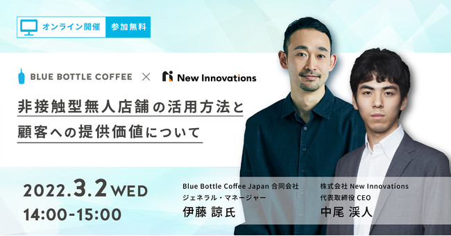 株式会社New Innovations(本社:東京都江東区、代表取締役 CEO:中尾 渓人、以下「New Innovations」)は、Blue Bottle Coffee Japan合同会社(本社:東京都江東区、ジェネラル・マネージャー 伊藤諒、以下「ブルーボトルコーヒー」)と非接触型無人店舗の活用方法と顧客への提供価値についての共催セミナーを3月2日にオンラインで開催いたします。