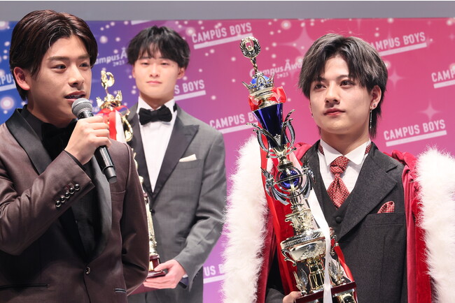 「CAMPUS BOYS 2023」【グランプリ】に飛鳥さんが選ばれ、ガウンとトロフィーが授与されました。飛鳥さんは【審査員特別賞】にも選ばれダブル受賞となりました。「1年間グランプリだけを目指して、色々な人を巻き込み助けてもらったので、グランプリをとれて本当によかったです。みなさんに感謝の気持ちを伝えたいです。ありがとうございました。」と受賞の喜びを噛み締めながら語りました。グランプリには、賞金200万円、雑誌「FINE BOYS」単独特集掲載、「Trepo」単独インタビュー記事掲載など豪華特典が贈られました。