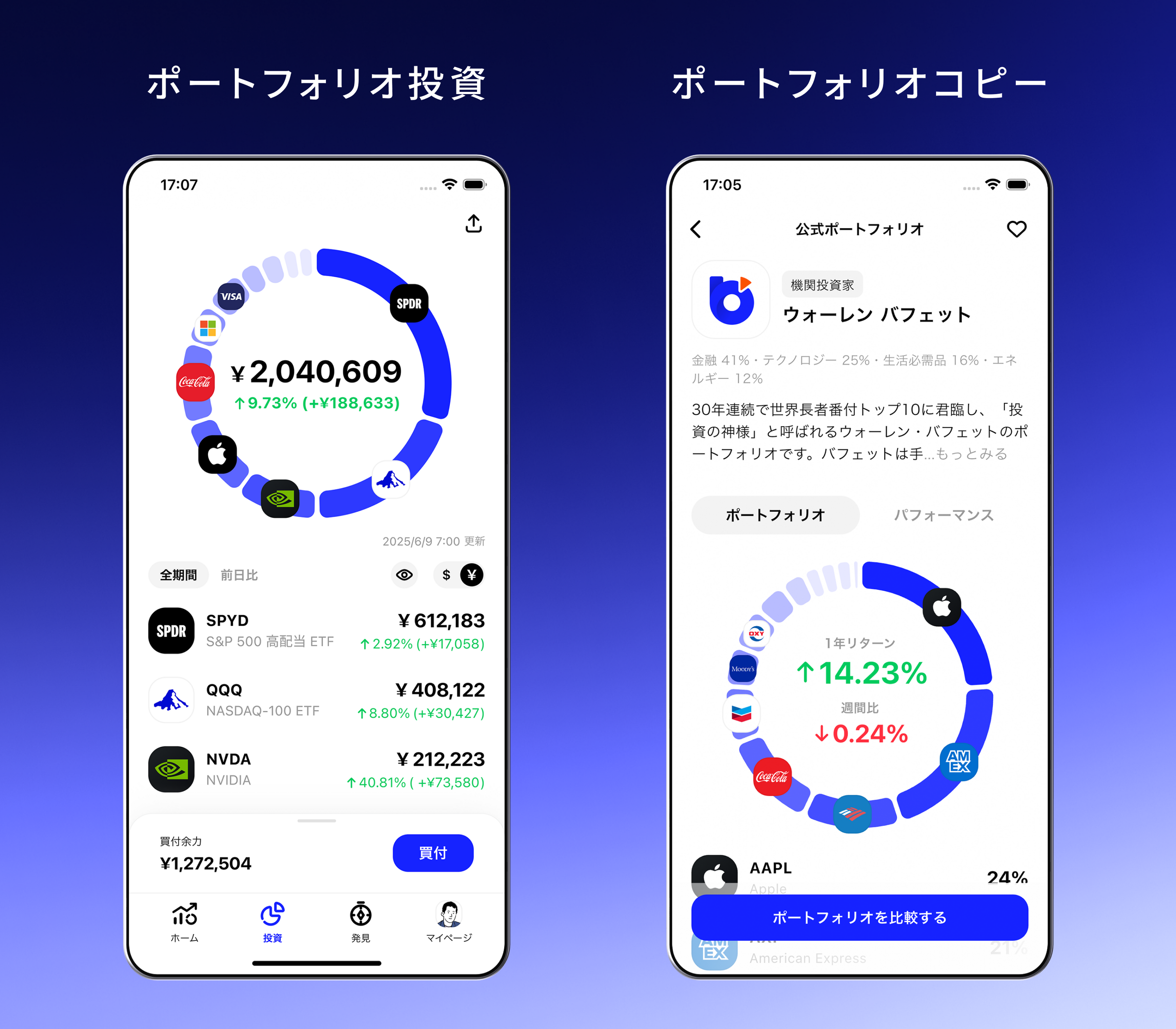 米国株・ETF投資アプリ「ブルーモ」は、2024年5月より、米国株・ETFでの高度な資産運用を手軽に実現できるサービスとして一般提供を開始しました。 投資したい銘柄と目標比率を設定するだけで、手間のかかる両替・売買、リバランスを代行する「ポートフォリオ投資機能」や、ウォーレンバフェットのような著名投資家のポートフォリオをそのままワンタップでコピーしたり他のユーザーのポートフォリオを参考にできる「ポートフォリオコピー機能」など、最先端でユニークな機能により、多くのユーザーの皆様から好評をいただいています。