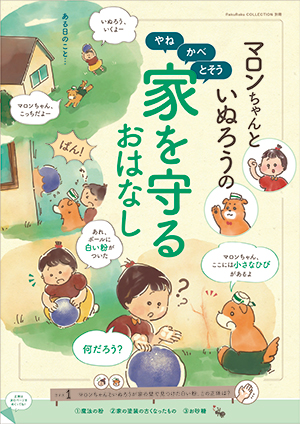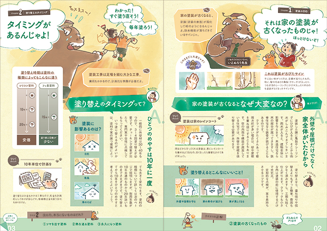 「マロンちゃんといぬろうの家を守るおはなし」は、塗装リフォームの基本を紹介する冊子です。マロンちゃん(小さな女の子)といぬろう(仔犬)のの可愛い掛け合いがいっぱいです。絵本のような優しいタッチで女性にも喜んで受け取っていただけます。楽しく読むうちに、いつの間にか塗り替えの大切さが分かり「うちもそろそろリフォームかしら」と思えてきます。