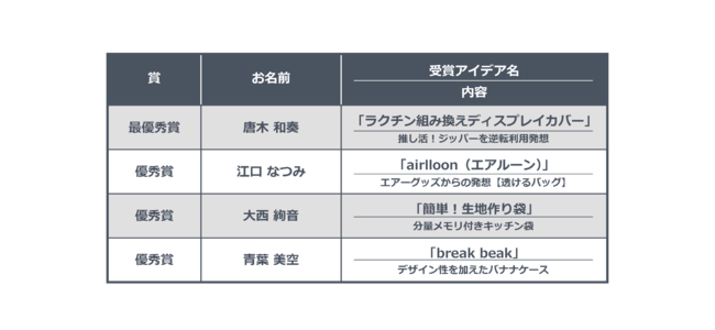 学生の皆さまへ、ポリ袋の歴史・種類や製造方法など実際に商品に触れながら学んでいただき、ポリエチレンフィルムで新たな用途開発などを検討してもらいました。学生からは26点ものアイデアを出していただきました。Z世代の若いデザイナーの想いが詰まった商品提案は、柔軟な発想で審査に難航しましたが、最優秀賞1点、優秀賞3点を選考し、12月16日に表彰式を行いました。