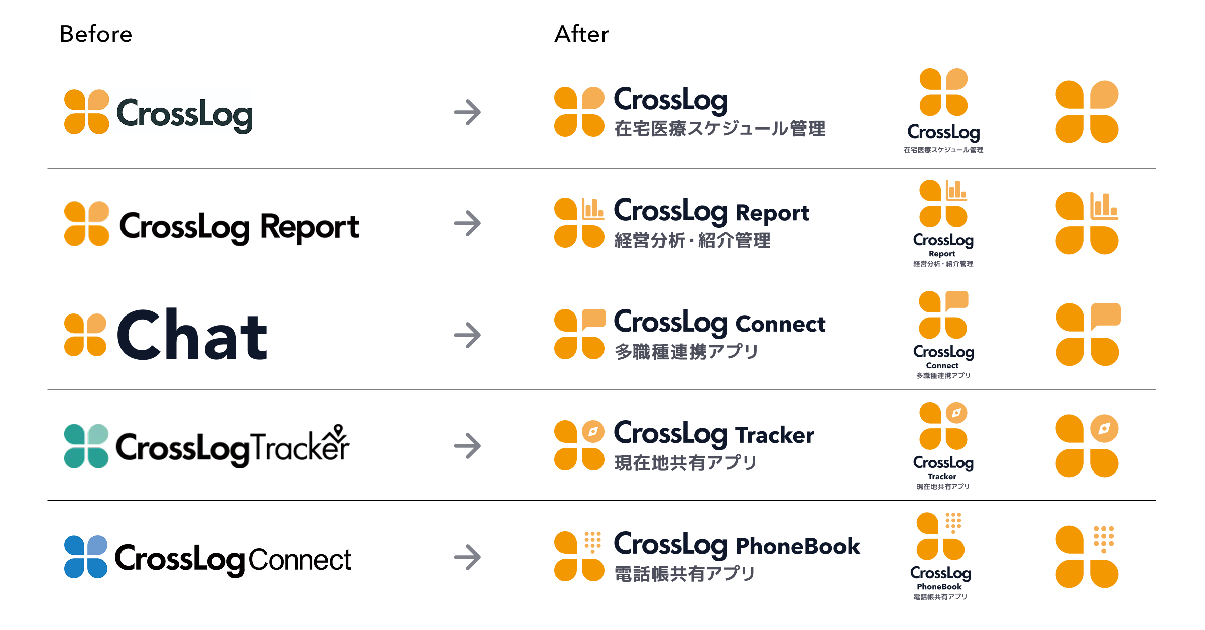 こうした変化を踏まえ、複数のサービスを「在宅医療DX支援サービス」としてより統一感のあるブランドとして整理し、クロスログ全体の価値をより直感的に理解いただけるよう、今回のブランド体系のリニューアルを実施しました。