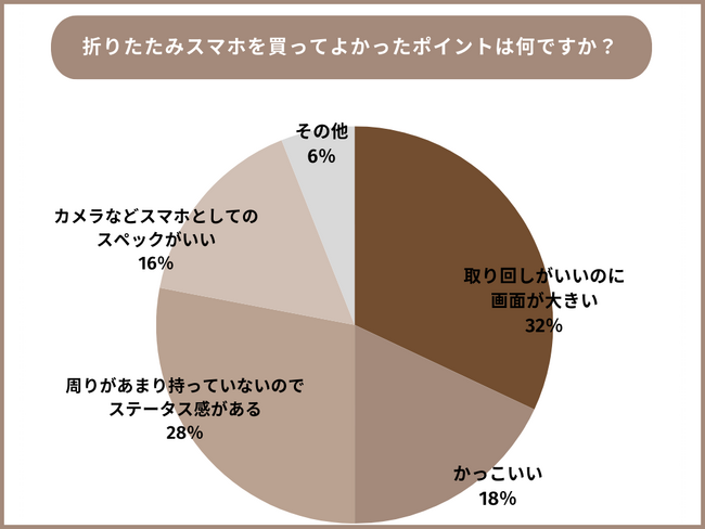 次に「周りがあまり持っていないのでステータス感がある」と答えたのが28%という結果は、折りたたみスマートフォンが独特なステータスシンボルとして機能していることを示しています。