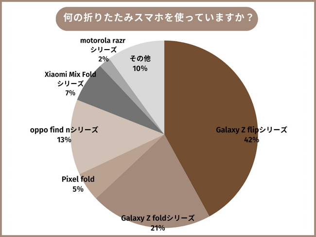 最も注目すべき点は、Galaxy Z Flipシリーズが42%という高い割合で使用されていることです。Galaxy Z Flipシリーズのデザイン・価格設定・機能性などが多くの消費者に受け入れられているのでしょう。