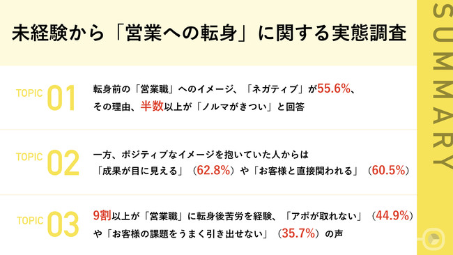 営業パーソンに向けたバイブル書『センスなし、根性なしでも売れる!マンガで学ぶ!営業の超基本』(https://www.amazon.co.jp/dp/4910017224)を執筆した小松麻美が取締役を務めるユームテクノロジージャパン株式会社(本社:東京都港区、代表取締役:松田しゅう平、https://www.umujapan.co.jp、以下、ユームテクノロジージャパン)は、営業職以外を5年以上行い、その後直近3年以内に未経験の営業職として人事異動もしくは転職した方108名を対象に、未経験から「営業への転身」に関する実態調査を実施いたしましたので、お知らせいたします。