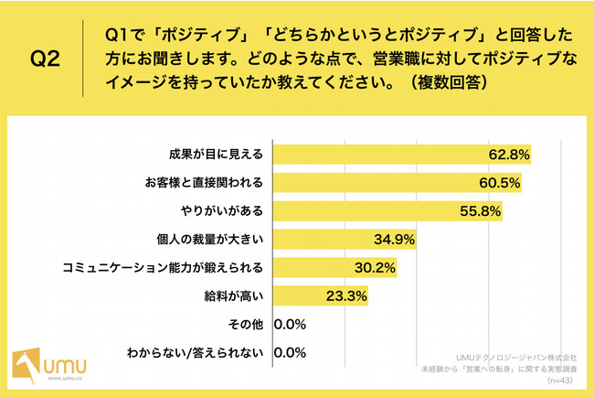 Q1で「ポジティブ」「どちらかというとポジティブ」と回答した方に、「Q2.どのような点で、営業職に対してポジティブなイメージを持っていたか教えてください。(複数回答)」(n=43)と質問したところ、「成果が目に見える」が62.8%、「お客様と直接関われる」が60.5%、「やりがいがある」が55.8%という回答となりました。