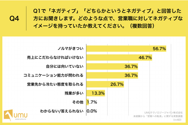 Q1で「ネガティブ」「どちらかというとネガティブ」と回答した方に、「Q4.どのような点で、営業職に対してネガティブなイメージを持っていたか教えてください。(複数回答)」(n=60)と質問したところ、「ノルマがきつい」が56.7%、「売上にこだわらなければいけない」が46.7%という回答となりました。
