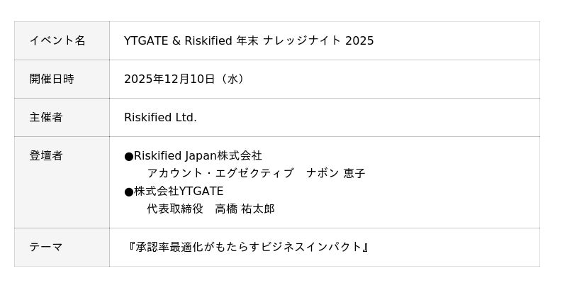 株式会社YTGATE(本社:東京都中央区、代表取締役:高橋 祐太郎、以下「YTGATE」)と Riskified Ltd.(本社:イスラエル、代表取締役社長:イド・ガル、以下「Riskified」)は、2025年12月10日、『 YTGATE & Riskified 年末 ナレッジナイト 2025』を開催しました。本イベントでは、「承認率最適化がもたらすビジネスインパクト」をテーマに、今後のECにおける課題解決策と成長戦略について議論を交わしました。