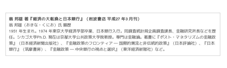 日本銀行入行後、調査統計局企画調査課長、金融研究所長等を務めた翁氏は、金融論が専門。多くの著書や論文を発表、また岩田規久男氏とマネーサプライ論争を行うなど、政策決定の現場を踏まえた専門家として積極的に発言されてきました。