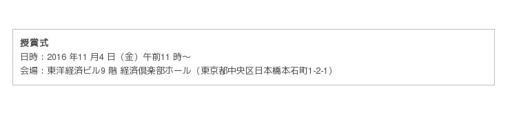 授賞式、ならびに記念講演(経済倶楽部主催)は11 月4日(金)、東洋経済ビルで行われます。