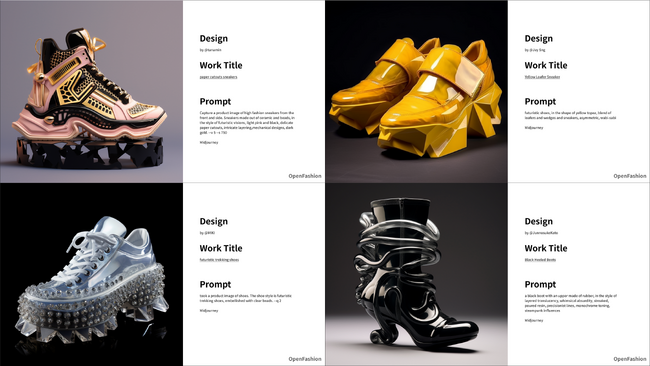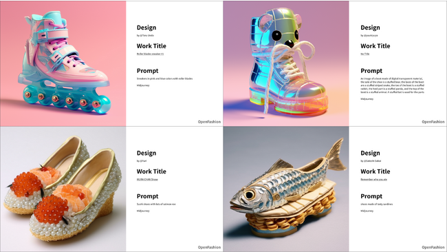 そして今回のプロンプトブック#2に収録されている作品は、オムニス社メンバーのデザインのみで構成されたプロンプトブック#1とは異なり、コンテストに参加いただいた一般の”AIクリエイター(※)”たちによるデザインです。誰でも参加可能な本コンテストには、AI×ファッションに関する交流の場である「OpenFashion コミュニティ」を通じて多くの方にご参加いただいたことで、6日間で2,000以上の創造性豊かなシューズのデザインが生まれました。