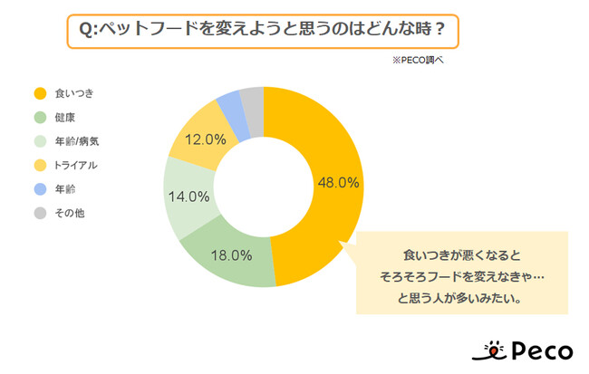 まず、「キャットフードの買い替えのタイミングはいつ?」の問いに、半数近い48%の方が「食いつきの変化」と答え、「健康」18%や「年齢/病気」14%よりも大きく上回る結果となりました。