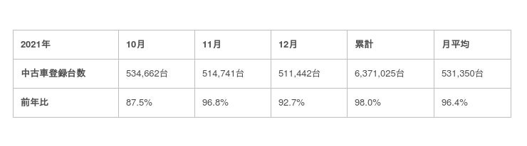 【中古車市場統計レポート(2021年12月)】より抜粋してご案内いたします。