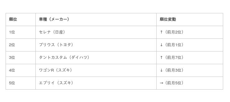 国産車の車種別ランキングを見てみると、セレナ(日産)が3ヶ月ぶりに1位にランクイン。また、前回圏外だったジムニー(スズキ)が8位にランクインしています。