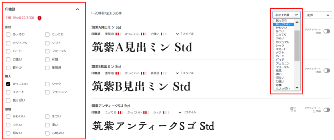 フォント選定の時間短縮や、表現したいデザインの「イメージ」「印象」に合わせたフォント選びにご活用いただけます。