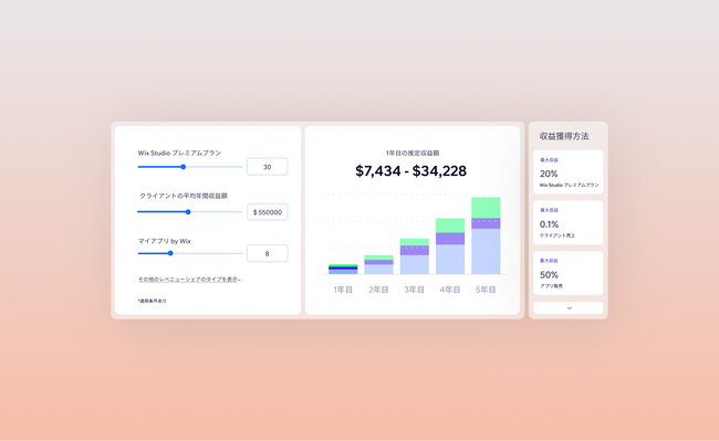 パートナーは、Wix Studio でサイト制作をした初日からレベニューシェアを獲得でき、Wix パートナープログラムの経済的なメリットがさらに充実