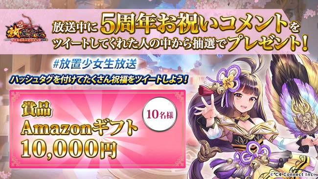 C4 Connect株式会社(本社:東京都新宿区)は、現在サービス中のスマートフォンアプリ、美少女RPGゲーム『放置少女〜百花繚乱の萌姫たち〜』(以下、『放置少女』)が3月6日(日)より「祝!みんなの愛に包まれ五周年!」と題した生放送を配信することをお知らせいたします。