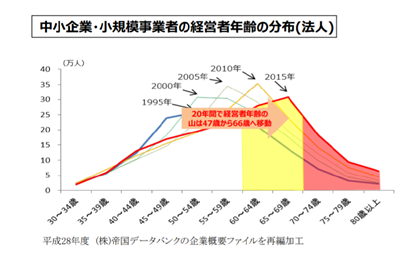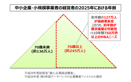 2025年までに、70歳(平均引退年齢)を超える中小企業・小規模事業者の経営者は約245万人となり、その約半数の127万(日本企業全体の1/3)が後継者未定。