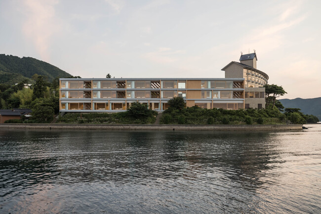 ユネスコジオパーク認定の風光明媚な島の港に建つ美しいホテル。既存の一部と繋ぎつつ、特別な機械や装置に頼らず「自らを島の風土にフィットさせる」このミニマムに徹した空間は、CLTのシンプルな構成と合わせ、心地よさを演出している。