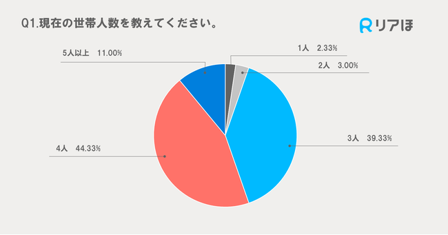 今回アンケートを取った属性は、世帯人数4人が44.33%、3人が39.33%と、夫婦と子ども1人もしくは2人のご家庭がメインとなります。