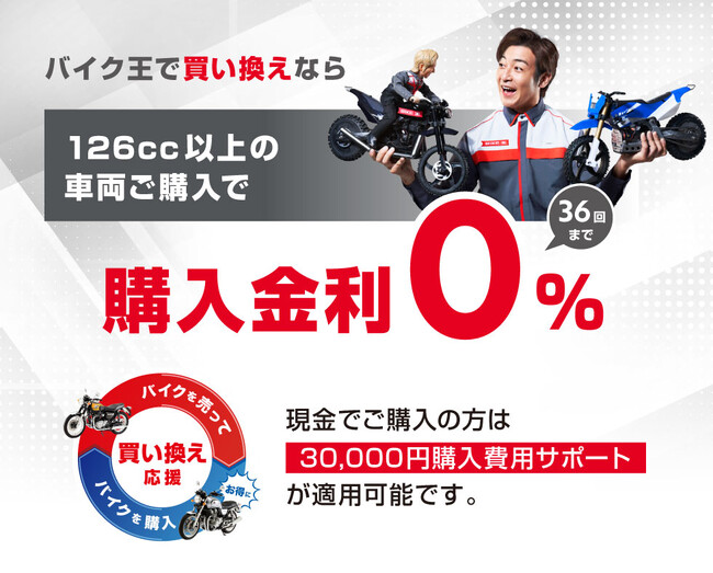 「まだ世界にない、感動をつくる。」をコーポレートミッションに掲げ、ビジョンである「バイクライフの生涯パートナー」の実現に向けて、事業を展開する株式会社バイク王&カンパニー(代表取締役社長執行役員:石川秋彦、本社:東京都世田谷区、証券コード:3377、以下「当社」)は、買い替え応援として、既存のサービスに「ローン金利0円サービス」を追加し、バイク王で買い替えをした方を対象に「最大3万円費用サポート」か「ローン金利0円」のどちらかを選ぶことができるお得な購入サポートサービスを常設サービスとして12月9日(土)より開始いたしました。