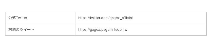 公式Twitter(@GAGEX_official)をフォローして、対象のツイートをキャンペーン期間内にリツイートする。本キャンペーン終了時までフォローを継続していることが条件となります。