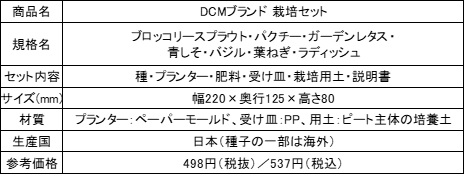 当社では、初心者向けの室内家庭菜園シリーズ「DCMブランド 栽培セット」を昨年1月に発売して以来、水を準備するだけで始められる手軽さや、コンパクトなサイズでも十分な収穫量を確保できることなどから、人気のシリーズとなっています。