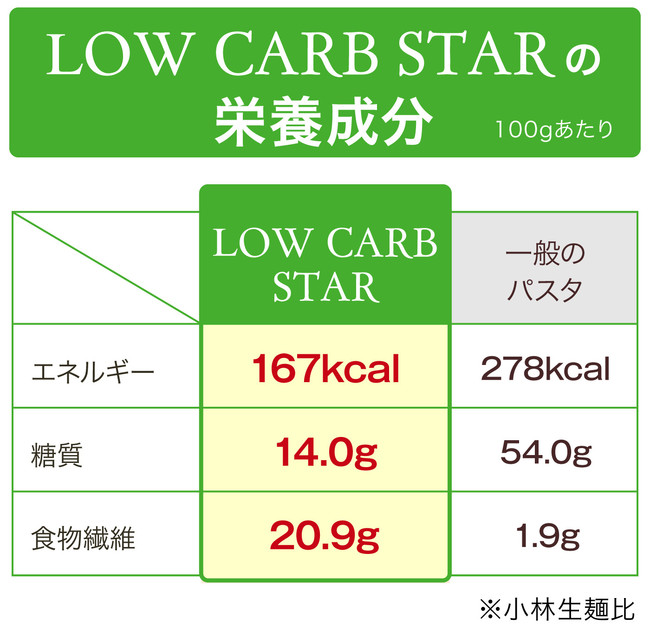 体重を落とす際に勘違いされがちなのが“糖質ゼロがよい”という考え方。実はこれ、絶対NG! 脂肪を燃焼するには火種となるエネルギーが必要となり、糖質は脂肪燃焼の火種の役割を果たします。つまり、ボディメイクには“適度な糖質”が必要なのです。『LOW CARB STAR Spaghetti』は、一般的なパスタと比べ74%OFFの絶妙な糖質バランスで、手軽にダイエットをサポートします。