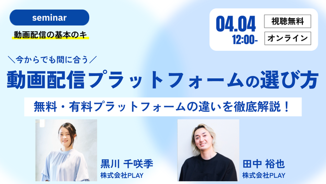 この度株式会社PLAYは、4月4日(火)12時〜開催するセミナー「【動画配信の基本のキ】動画配信プラットフォームの選び方」の申し込みページを公開しました。