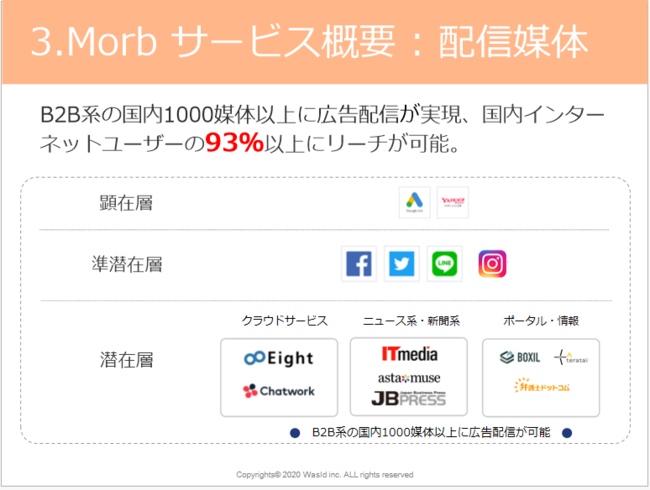 「BtoB特化型完全成果報酬型オンラインリード獲得支援サービス Morb(β版)」は、BtoB商材に特化した完全成果報酬型オンラインリード獲得支援サービスになります。Wasld株式会社(以下、弊社)が広告費とクリエイティブ制作費用を全て立て替えて、発生したリードの件数に対して後払いにてお支払いいただきます。(初期費用、維持費用 0円)