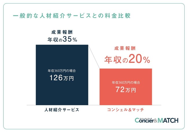 「コンシェル&マッチ」はコンシェルジュ対応のきめ細かさと自動化によるスピードを組み合わせたハイブリッド型のサービスで、従来よりも活用しやすい費用の人材紹介サービスです。一般的に年収の35%以上とされる紹介サービス利用料金を、20%以下で提供可能です。