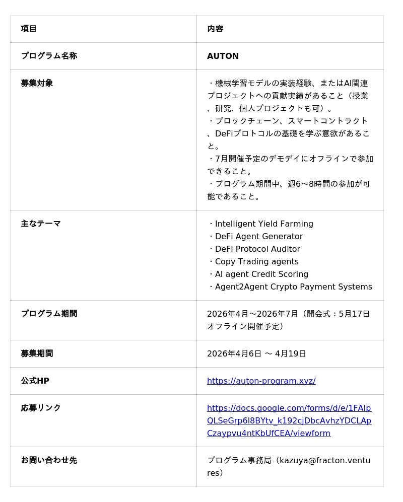 Fracton Ventures株式会社(本社:東京都品川区、代表取締役:鈴木 雄大、亀井 聡彦)は、SMBC日興証券株式会社、株式会社Next Finance Tech、東京大学協創プラットフォーム開発株式会社、Prime Beat株式会社と共同で、分散型金融(DeFi)分野と人工知能(AI)分野の人材交流および共同ビジネス開発を活性化することを目的としたアクセラレーションプログラム「AUTON」(以下、「本プログラム」)を立ち上げます。本プログラムでは、DeFi分野への技術応用に意欲のあるAI領域の学生・研究者・エンジニアを中心に参加者を募集いたします。