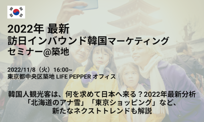 株式会社LIFE PEPPER (本社:東京都中央区築地、代表取締役社長:冨永 重人、吉田 行弘、斉藤 諒、以下「LIFE PEPPER」)は、2022年最新の韓国インバウンドマーケティングセミナーの開催をおしらせします。「北海道のアナ雪」「東京ショッピング」など、最新の旅行トレンドも盛り込んだセミナーを無料でお伝えします。