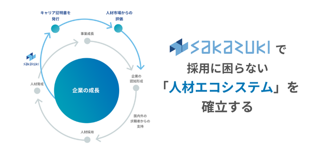 「sakazuki(サカズキ)」は、キャリア証明書の発行によって「個」の成長を促進し、彼らの人材市場における評価を企業認知度の向上に繋げることで、あらゆる企業を人材輩出企業へと導く人材サービスです。