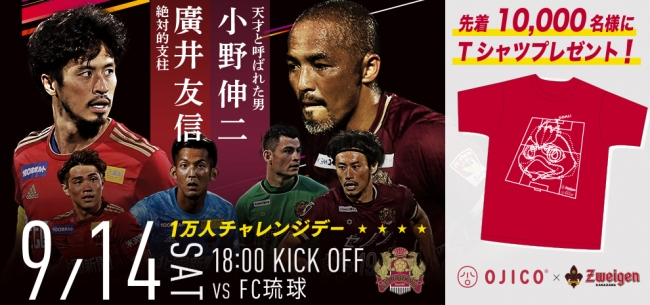 当日は、人気Tシャツブランド「OJICO(オジコ)」とのオリジナルコラボTシャツを先着8,000名様にプレゼントとご案内しておりましたが、1万人のファン・サポーターでスタジアムを真っ赤に染めるべく制作数を10,000枚に増やすことも決定!