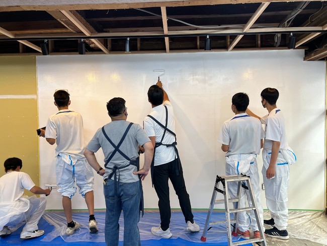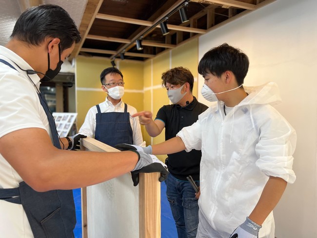 開会式終了後には参加者全員で山下新天街アーケードへ移動し、改めて空き家の構造や実態の説明を受けた後、市長、松田丈志氏、そして参加した市民と学生全員で、ついたての作成体験、室内の塗装体験、塗り壁体験などのDIYを体験しました。参加した市民によると、「新たな取り組みを、若い子や、街の方達と一緒にやっていくっていうのはすごく素敵だなと思う」、「空き家DIYなど空き家に触れる貴重な体験ができた」や「市の空き家施策や市長の考えについて直接知れてよかった」など好感を持たれた印象でした。参加した高校生によると「みんなと楽しくイベントができた」とDIYを通じてチームとなってコミュニケーションが取れたこと、また「普段しないような経験をさせてもらった」、「やったことのない経験ができて、将来役に立つと思う」といった回答もあり、空き家活用株式会社の和田は「地元の高校生がこの体験をきっかけに将来、商店街で起業してくれたら嬉しいですね」とコメントしました。