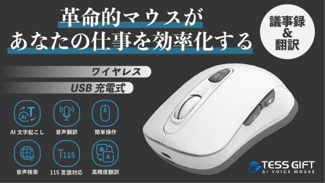 『TESS GIFT AI ライティングマウス』は話しかけるだけで文字起こしする機能に加え、自分の言語を115言語に翻訳してテキスト化する機能も搭載されております。これにより仕事効率を劇的に向上させることが可能になります。