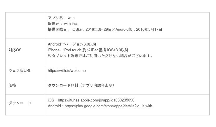 社名 : 株式会社with(株式会社ダブリューから2023年3月1日に社名変更)英語社名 : with, Inc.代表者 : 代表取締役CEO五十嵐 昭人本社所在地 : 東京都渋谷区恵比寿1-19-19恵比寿ビジネスタワー17F運営開始日 : 2023年3月1日(※株式会社エニトグループから会社分割により事業を承継した日)事業内容 : マッチングアプリ 『with』の運営主要株主 : 株式会社エニトグループ(100%)■20代中心に価値観重視の出会いを提供するマッチングアプリ『with』とはマッチングアプリ『with』は2015年9月にサービスを開始した、主に20代の方に真面目な出会いの場としてご利用いただいている、価値観でマッチング可能な恋活・婚活マッチングアプリです。統計学×心理学により自身に合った最適なパートナーを探せるサービスをめざしており、自分と同じ価値観を持つお相手が見つかる「好みカード」機能や「心理テスト」で深層心理までを含めたマッチングを可能としています。また「一般社団法人結婚・婚活応援プロジェクト(MSPJ)」に参画し、業界全体の活性化にも取り組んでいます。