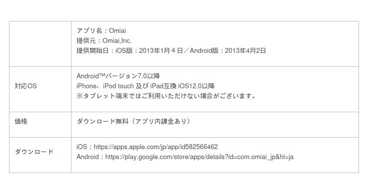 社名 : 株式会社Omiai英語社名 : Omiai, Inc.代表者 : 代表取締役CEO清水 宏昭本社所在地 : 東京都港区南青山1-2-6ラティス青山スクエア3F運営開始日 : 2023年3月1日(※株式会社ネットマーケティングから会社分割により事業を承継した日)事業内容 : マッチングアプリ 『Omiai』の運営主要株主 : 株式会社エニトグループ(100%)■結婚を見据えたまじめな出会いを提供するマッチングアプリ『Omiai』とは『Omiai』は、婚姻率低下や少子化といった社会課題を背景に、2012年2月に国内でサービス提供を開始した男女の出会いをサポートするマッチングアプリです。サービス開始以降、出逢いを探す多くの男女に支持され、これまでの累計会員数は900万人を超えました(*)。「一般社団法人結婚・婚活応援プロジェクト(MSPJ)」に参画し、業界全体の活性化にも取り組んでいるほか、多くの方の幸せ探しに貢献できるよう、顧客に寄り添ったサービス運営を行ってまいります。*2023年2月時点