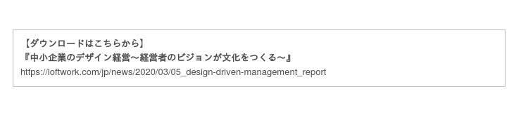株式会社ロフトワーク(本社:東京都渋谷区、代表取締役社長:諏訪 光洋)は、中小企業におけるデザイン経営実践に関する調査結果をまとめた報告書 『中小企業のデザイン経営〜経営者のビジョンが文化をつくる〜』を公開しました。本調査は「平成31年度関東経済産業局補助事業(地域中小企業知的財産支援力強化事業)」の一環として実施。2019年6月より経済産業省関東経済産業局、「グッドデザイン賞」を主催する公益財団法人日本デザイン振興会の協力のもと、スノーピーク、ファミリアをはじめデザインを経営に活かし成果をあげる中小企業8社を選定し調査を進めました。そこで得た知見や考察をまとめています。