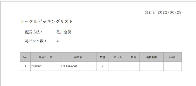 複数の出荷オーダーの商品をまとめてリストにしたものです。棚番順に出力ができ、ロットや消費期限の管理が可能です。ピッキング作業の事前準備がまとめてできるため、全体の作業工数を効率化することもできます。