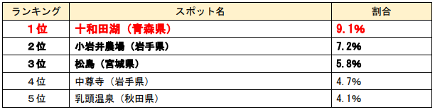 東北地方で人気のドライブの行き先は1位が「十和田湖(青森県)」、2位が「小岩井農場(岩手県)」、3位が「松島(宮城県)」でした。