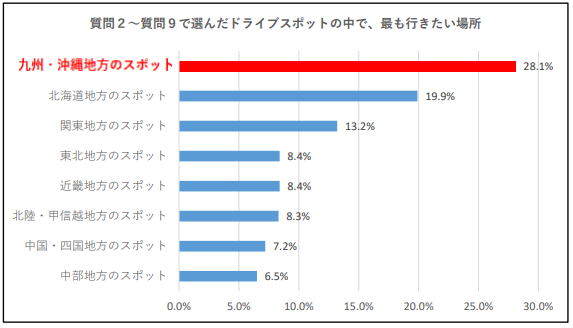 選んでいただいたドライブスポットの中で、最も人気の行き先は「九州・沖縄地方のスポット」で、約3割の方から選ばれているという結果になりました。