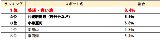 北海道で人気のドライブの行き先は1位が「美瑛・青い池」、2位が「札幌駅周辺(時計台など)」、3位が「小樽運河」でした。