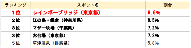 関東地方で人気のドライブの行き先は1位が「レインボーブリッジ(東京都)」、2位が「江の島・鎌倉(神奈川県)」、3位が「マザー牧場(千葉県)」と「お台場(東京都)」が同率でした。