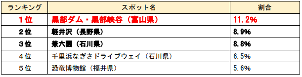 北陸・甲信越地方で人気のドライブの行き先は1位が「黒部ダム・黒部峡谷(富山県)」、2位が「軽井沢(長野県)」、3位が「兼六園(石川県)」でした。