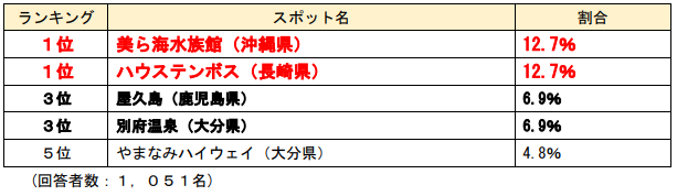 九州・沖縄地方で人気のドライブの行き先は1位が同率で「美ら海水族館(沖縄県)」と「ハウステンボス(長崎県)」、3位が同率で「屋久島(鹿児島県)」と「別府温泉(大分県)」でした。