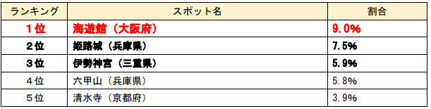 近畿地方で人気のドライブの行き先は1位が「海遊館(大阪府)」、2位が「姫路城(兵庫県)」、3位が「伊勢神宮(三重県)」でした。