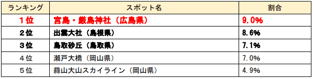中国・四国地方で人気のドライブの行き先は1位が「宮島・厳島神社(広島県)」、2位が「出雲大社(島根県)」、3位が「鳥取砂丘(鳥取県)」でした。
