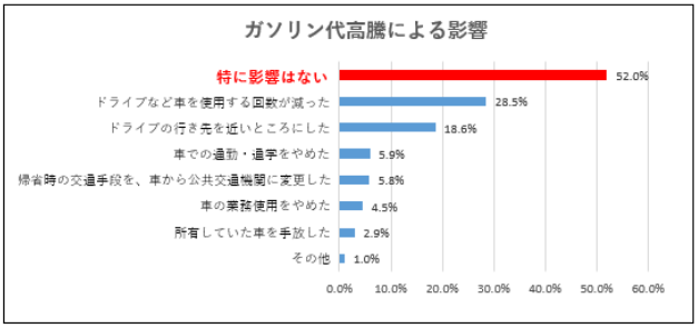 ガソリン代高騰により、自身の車利用(自家用車・レンタカー・カーシェア含む)に「特に影響がない」と回答した方は全体の52.0%になりました。